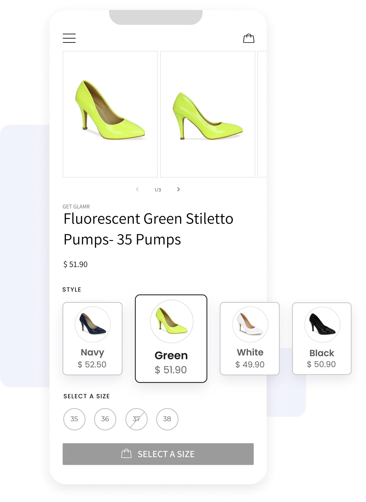 View ExampleRevamp your product showcase by adding eye-catching swatches featuring variant pricing, simplifying the shopping journey and conserving valuable time for your customers.