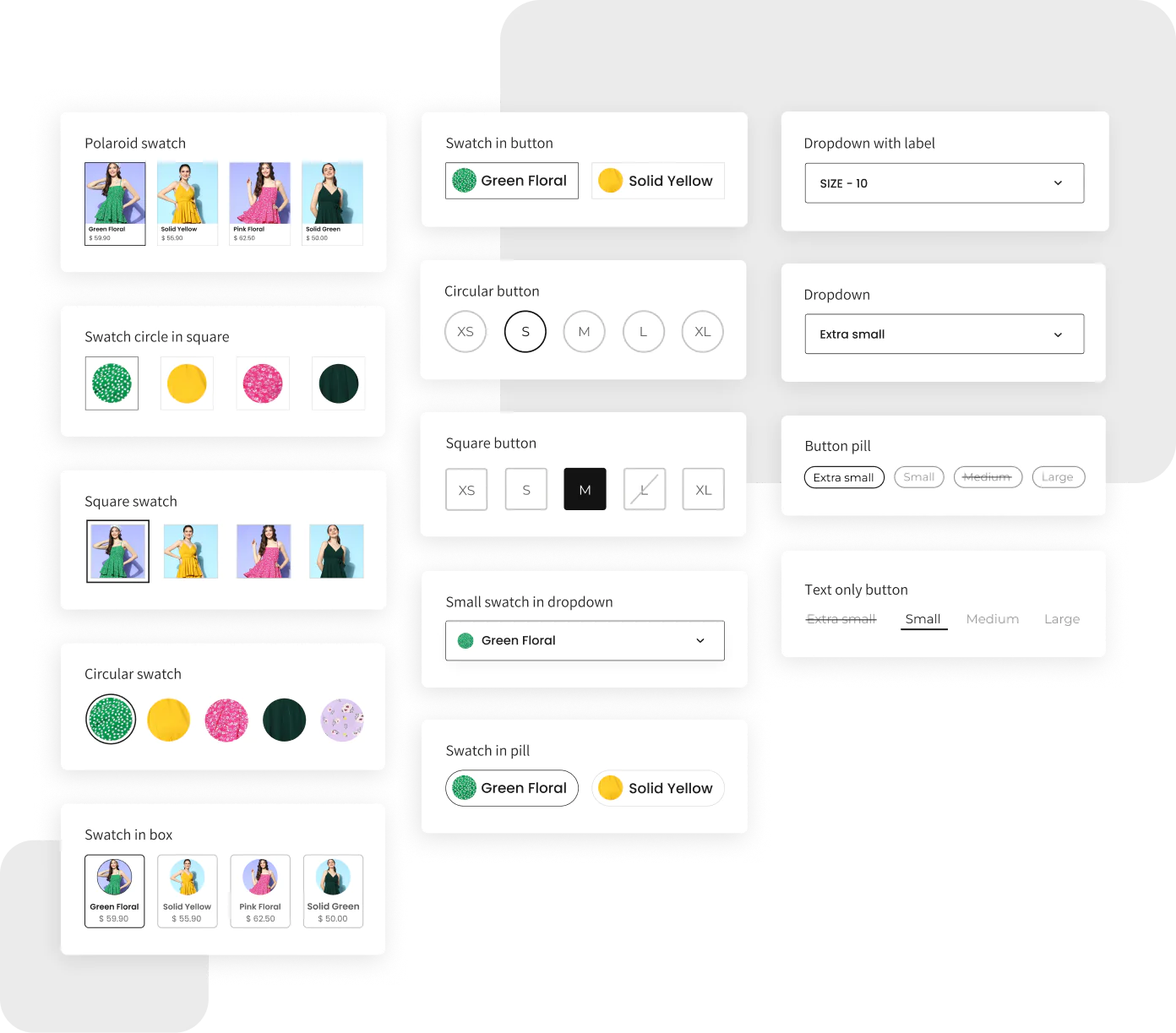 Swatch King offers a comprehensive library of pre-built dropdown, swatch, and button designs that can be quickly integrated into your Shopify store. These designs are carefully curated to provide an intuitive and engaging user experience while maintaining the visual coherence of your storefront.